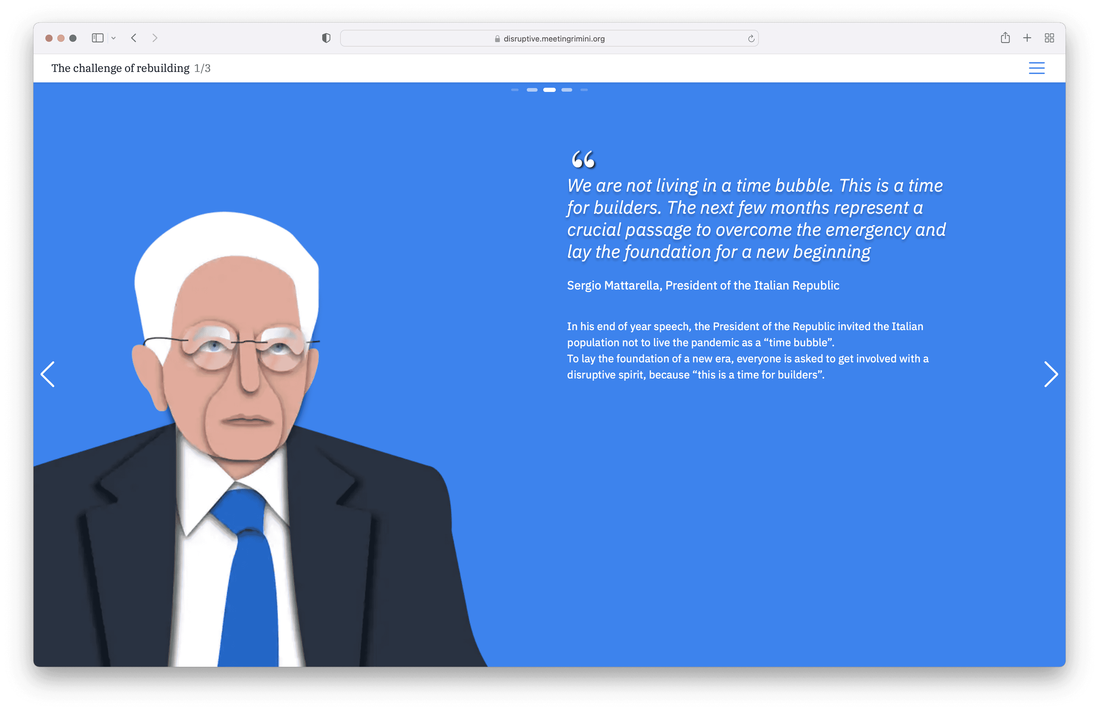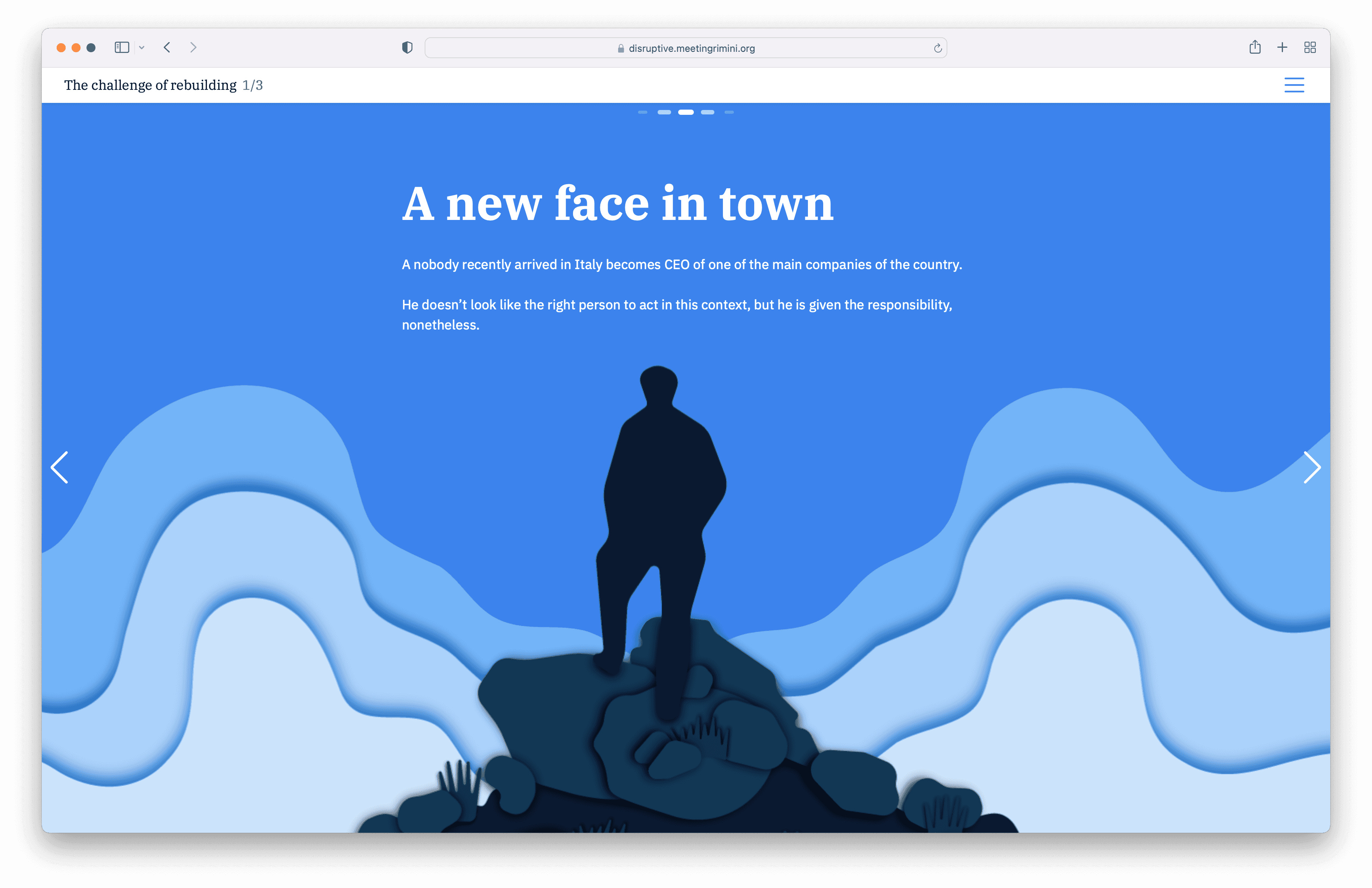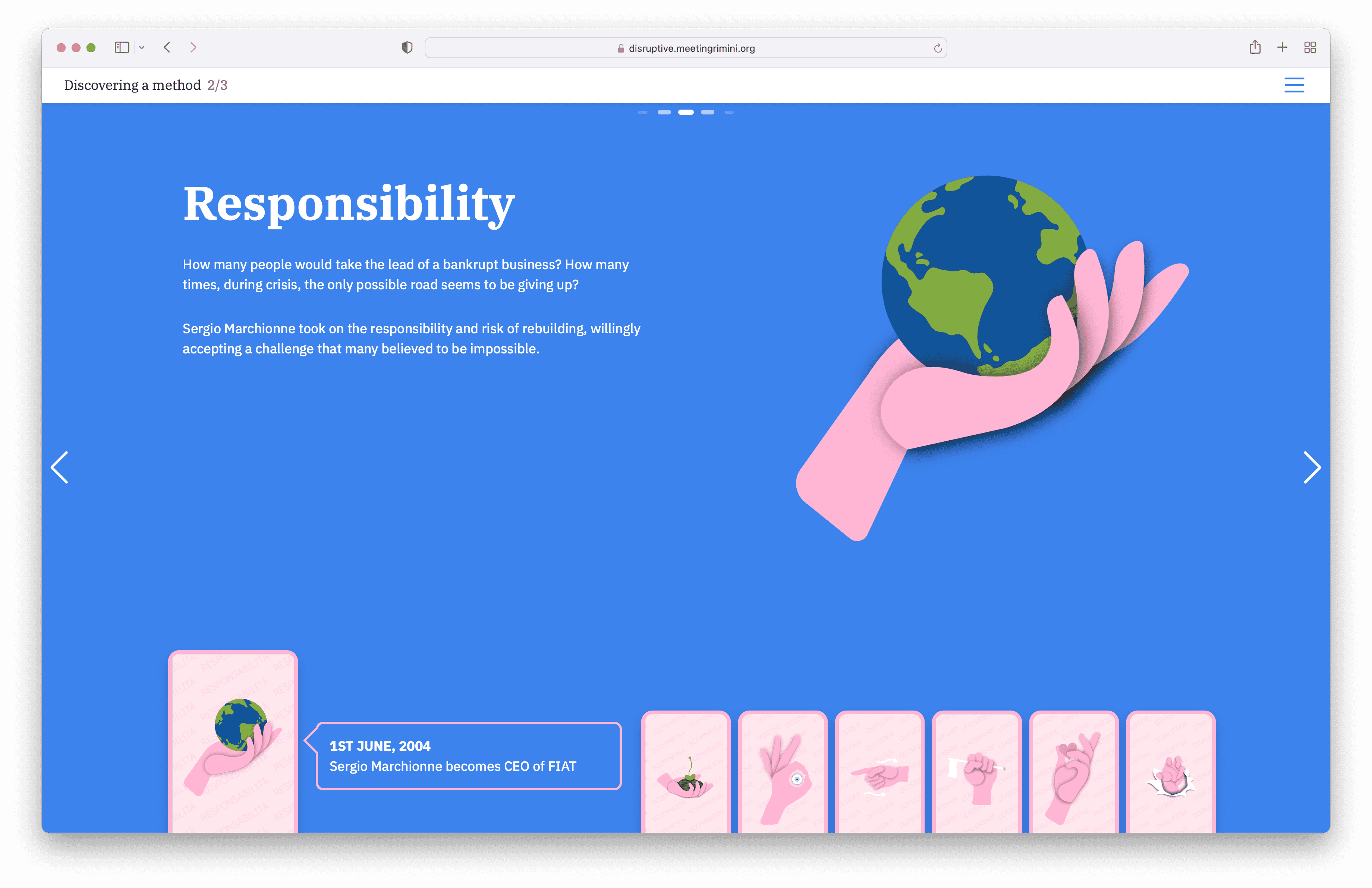 Visual, experience and experiential design seamlessly blend with storytelling giving birth to an engaging and fascinating 360º experience. Thanks to original content, such as illustrations, video-interviews and other digital content, Disruptive is a completely new way of exploring and approaching the great rebuilding challenge that awaits.