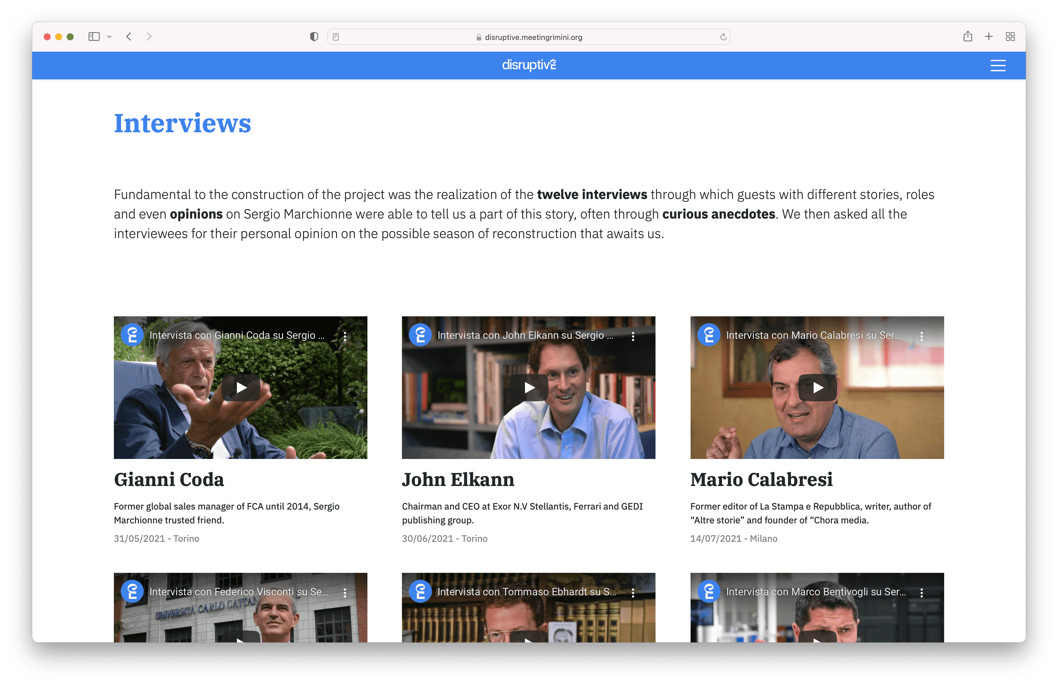 The project was designed during the pandemic. As COVID restrictions decreased, we were also able to give birth to a phisical exhibibition at Riminifiera, designing a space to present the project, the interviews and the life of Sergio Marchionne.